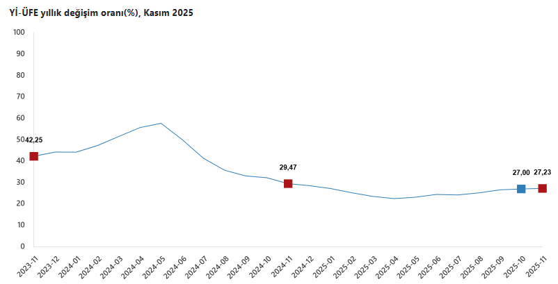 TÜİK üretici fiyat endeksi verisini açıkladı. Yİ-ÜFE (2003=100) 2025 yılı Kasım ayında bir önceki aya göre yüzde 0,84 artış, bir önceki yılın Aralık ayına göre yüzde 26,72 artış, bir önceki yılın aynı ayına göre yüzde 27,23 artış ve on iki aylık ortalamalara göre yüzde 25,37 artış gösterdi.