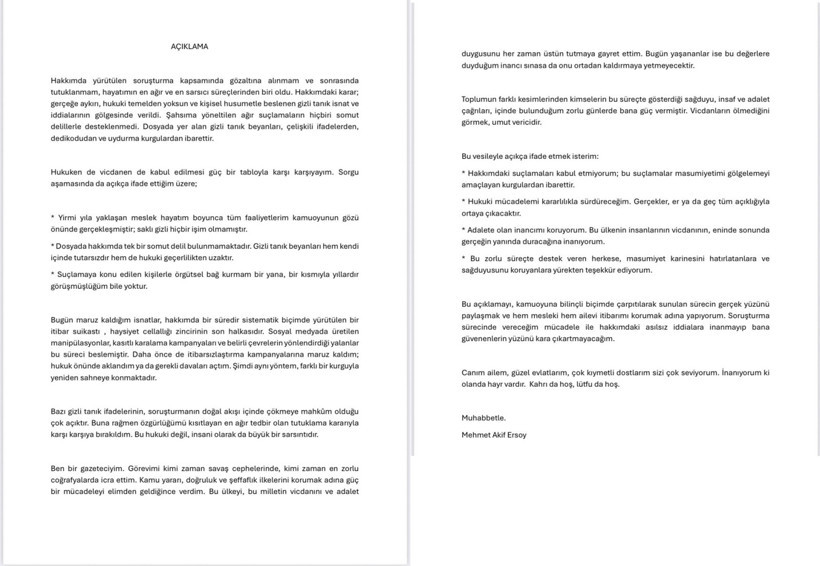 İstanbul Cumhuriyet Başsavcılığı tarafından yürütülen soruşturma kapsamında eski Habertürk TV Genel Yayın Yönetmeni Mehmet Akif Ersoy tutuklanmıştı. İsmail Saymaz, avukatları aracılığıyla bir açıklama gönderen Ersoy’un, suçlamaları ve iddiaları reddettiğini ifade etti: